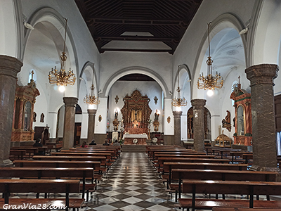 Su interior está compuesto por tres naves separadas por grandes pilares macizos octogonales, realizados con piedra de sierra Elvira, formando arcos de medio