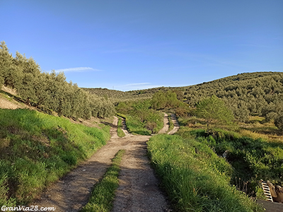 Esta senda amplía su anchura hasta convertirse en una pista que discurre también entre olivos y en ocasiones rodeados por una tupida vegetación de arbustos que