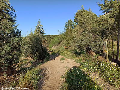 Después de caminar 750 metros por esta amplia y cuidada pista manteniendo la dirección oeste, llegando al cauce del arroyo de los Zagales, se presenta una bifurcación.