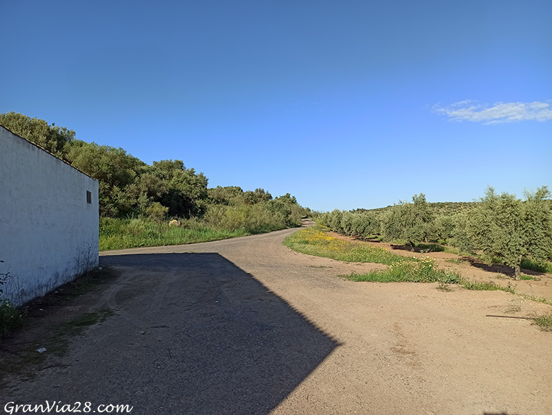 Ahora llaneando entre el inmenso olivar, avanzo por esta pista de tierra a lo largo de una recta de 1 Km, en la que los olivos muestran su incipiente y abundante fruto,