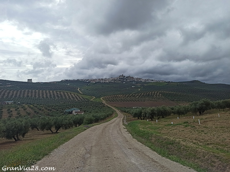 Ya fuera del núcleo urbano, una panorámica me ofrece la visión de un inmenso campo de olivos y la pista de tierra que discurre entre ellos, por cuyo trazado