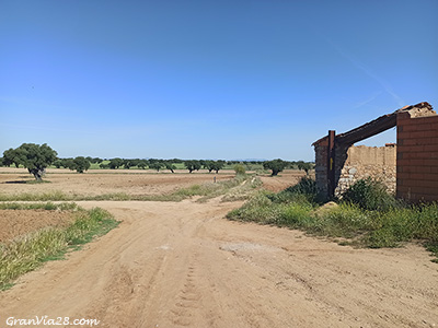 Nada más cruzar perpendicularmente la carretera A-430, inicio la andadura por una amplia pista de tierra que da servicio de acceso a las fincas y explotaciones agrícolas y/o ganaderas