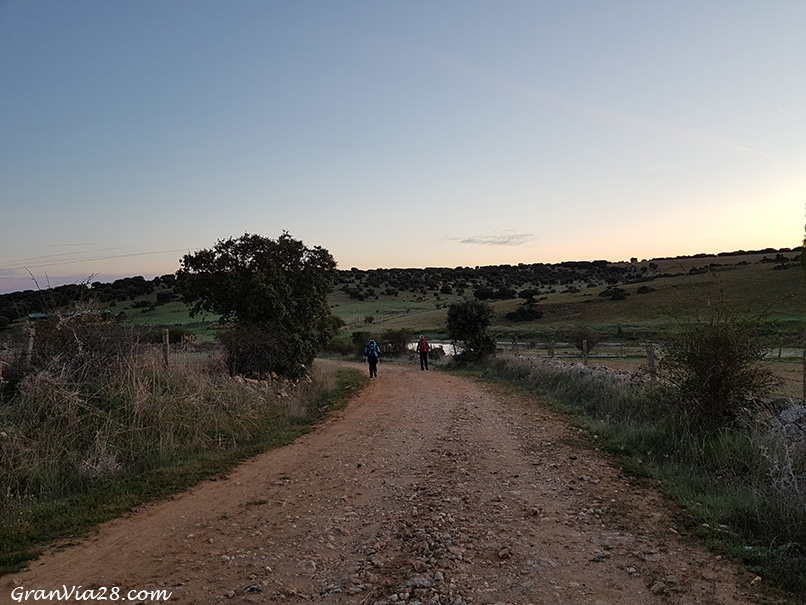 Ya con la luz del amanecer salgo de la población a través de una amplia pista, mostrando el horizonte las primeras luces a la vez que el cielo azul