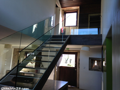 que sala de descanso de cuya parte central parten unas escaleras acristaladas para acceder a la primera planta.