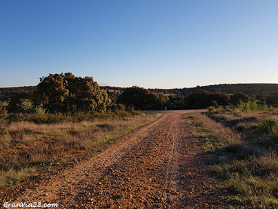 Ahora una larga recta se abre ante mis ojos, con el suelo de tierra color rojizo, que con suaves ascensos y descensos me conduce a través de estos campos de siembra en ocasiones entrecortados por encinas.
