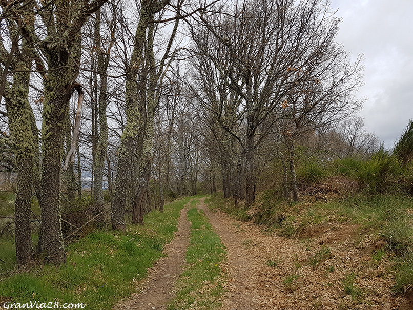 Nada más cruzar perpendicularmente esta carretera, me adentro ahora en una zona de bosque mucho más cerrado que el anterior, a través de una pista también de tierra en la que el verde césped cubre parte de su superficie.