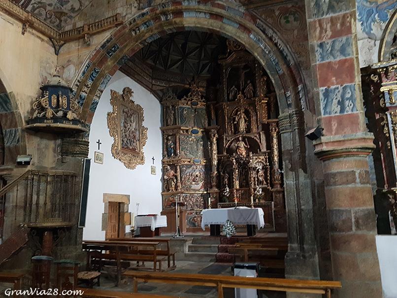 Por ejemplo, el colosal retablo de madera policromada que cubre todo el frontal del ábside. Debido a su gran tamaño hubo de montarse en zig – zag para que cupiese.