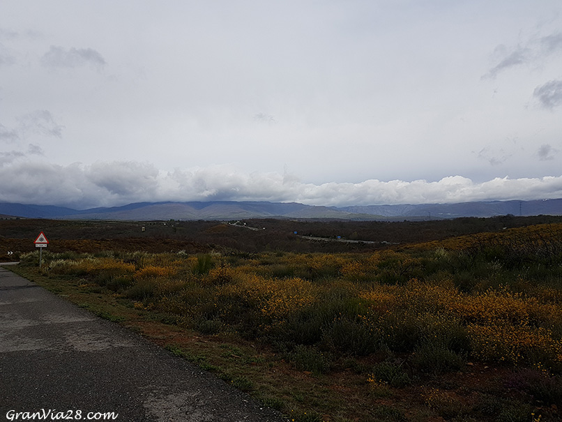 Apenas 300 metros después, alcanzo una cota elevada desde la que se divisa un paisaje inmenso, con el trazado de la autovía, las montañas al fondo y las nubes que hacen de corona sobre ellas.