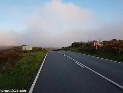 A las puertas del establecimiento, la carretera se abre ante mí con el mojón del Camino que señaliza la dirección hacia Laza.